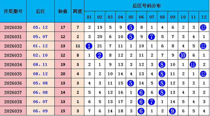 后区第二位:前10期开出奖号:其中奇数号码开出4次,偶数号码开出6次,奇偶走势偶数胜出,本期注意偶数号码出现。参考号码:10。